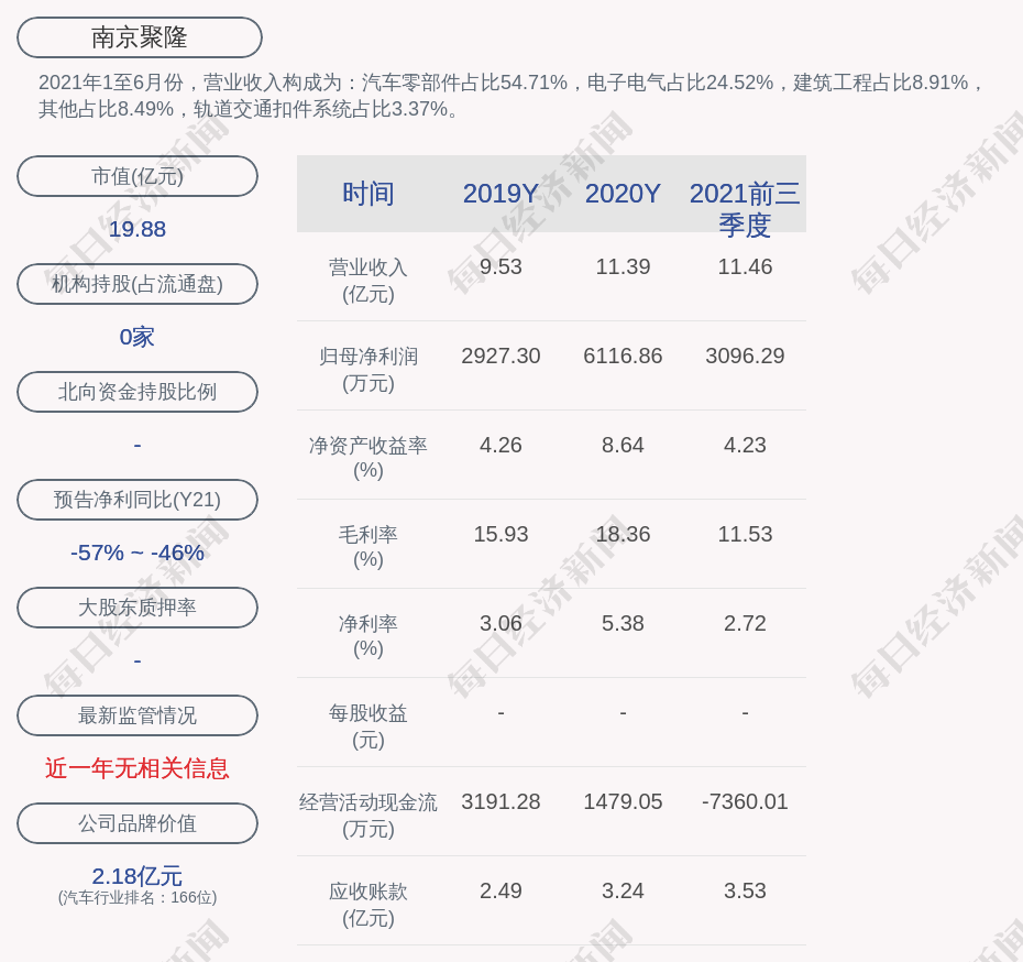 2021年1至6月份,南京聚隆的营业收入构成为:汽车零部件占比54.71%,电子电气占比24.52%,建筑工程占比8.91%,其他占比8.49%,轨道交通扣件系统占比3.37%。