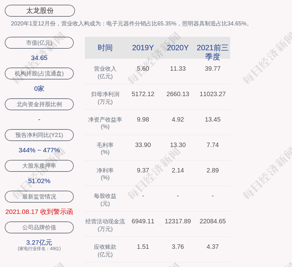 2020年1至12月份,太龙股份的营业收入构成为:电子元器件分销占比65.35%,照明器具制造占比34.65%。