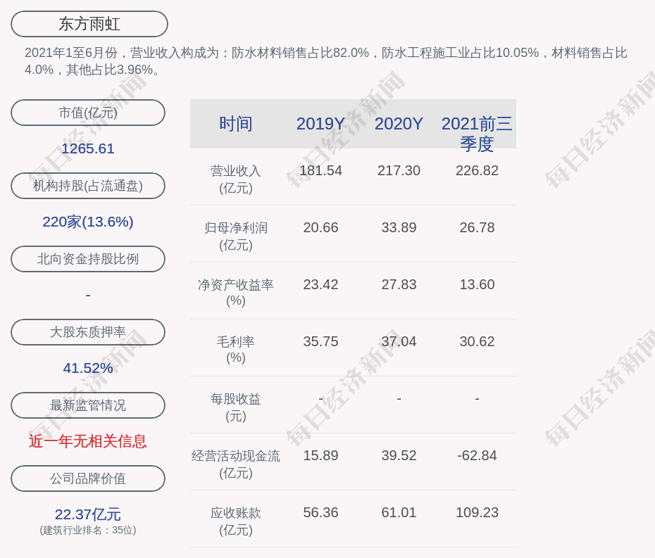 2021年1至6月份,东方雨虹的营业收入构成为:防水材料销售占比82.0%,防水工程施工业占比10.05%,材料销售占比4.0%,其他占比3.96%。