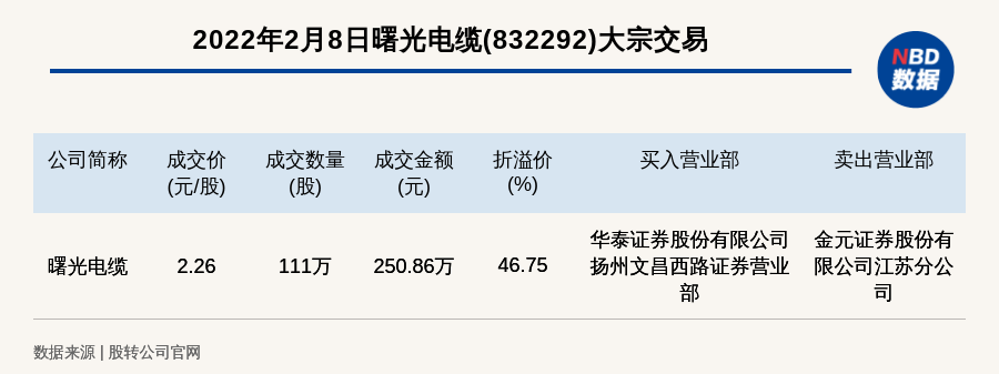 每经讯,2022年2月8日,新三板基础层公司曙光电缆(832292)发生一笔大宗交易,成交价2.26元/股,成交数量111万股,成交金额250.86万元,溢价46.75%。买入营业部是华泰证券股份有限公司扬州文昌西路证券营业部,卖出营业部是金元证券股份有限公司江苏分公司。