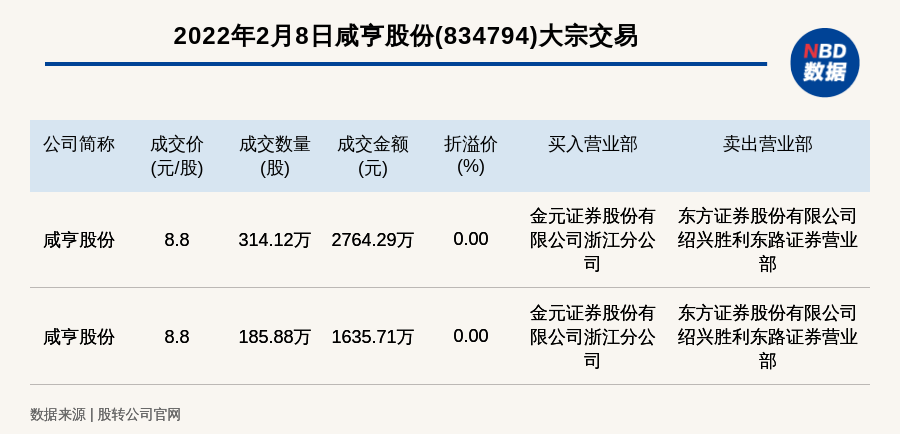 每经讯,2022年2月8日,新三板基础层公司咸亨股份(834794)发生2笔大宗交易,总成交金额为4400万元,成交金额最高的一笔成交价8.8元/股,成交数量314.12万股,成交金额2764.29万元,为平价交易。买入营业部是金元证券股份有限公司浙江分公司,卖出营业部是东方证券股份有限公司绍兴胜利东路证券营业部。