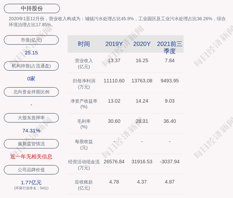2020年1至12月份,中持股份的营业收入构成为:城镇污水处理占比45.9%,工业园区及工业污水处理占比36.26%,综合环境治理占比17.85%。