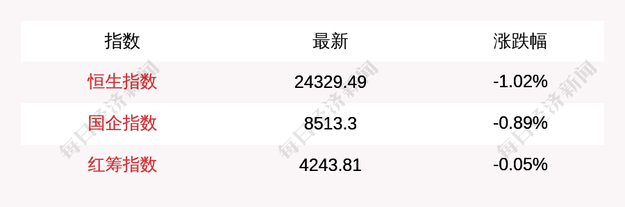 每经AI快讯:北京时间2月8日16:00,恒生指数收盘下跌250.06点,跌幅为1.02%,报收24329.49点;国企指数收盘下跌76.23点,跌幅为0.89%,报收8513.3点;红筹指数收盘下跌2.08点,跌幅为0.05%,报收4243.81点。南向资金当日净流入14.09亿港元。