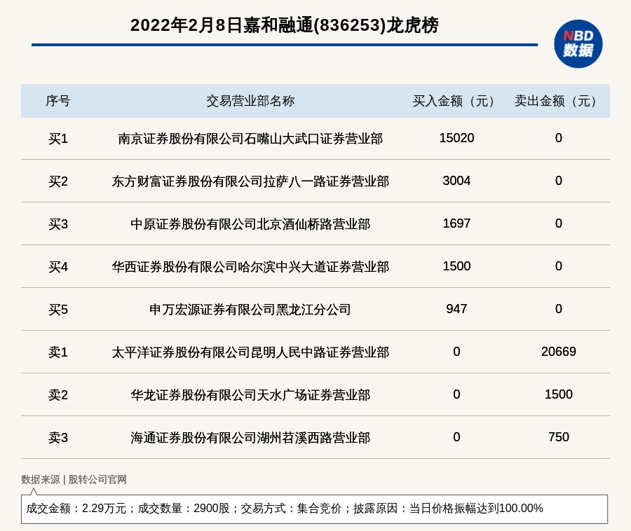 每经讯,2022年2月8日,新三板创新层公司嘉和融通(836253)登上龙虎榜,交易方式是集合竞价,披露原因是当日价格振幅达到100.00%,成交数量2900股,成交金额2.29万元。买一席位为南京证券股份有限公司石嘴山大武口证券营业部,买入1.5万元;卖一席位为太平洋证券股份有限公司昆明人民中路证券营业部,卖出2.07万元。