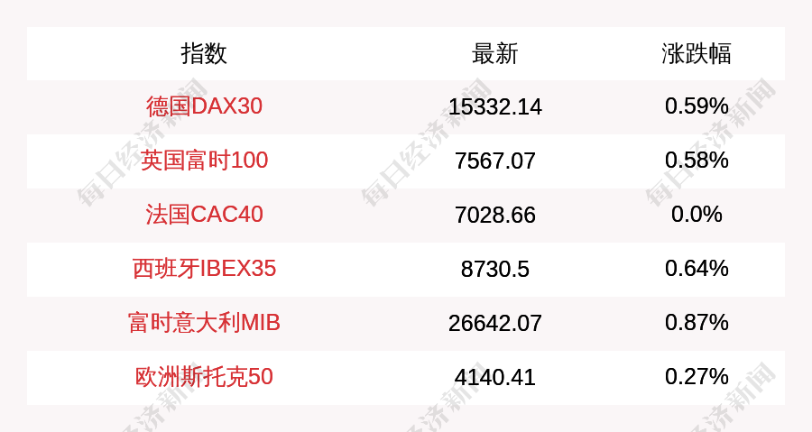 每经AI快讯:北京时间2月9日16:00,德国DAX30指数开盘上涨89.76点,涨幅为0.59%,报15332.14点;英国富时100指数开盘上涨44.04点,涨幅为0.58%,报7611.11点;法国CAC40指数平开,报7028.66点;西班牙IBEX35指数开盘上涨55.9点,涨幅为0.64%,报8730.5点;富时意大利MIB指数开盘上涨230.34点,涨幅为0.87%,报26642.07点;欧洲斯托克50指数开盘上涨11.16点,涨幅为0.27%,报4140.41点。