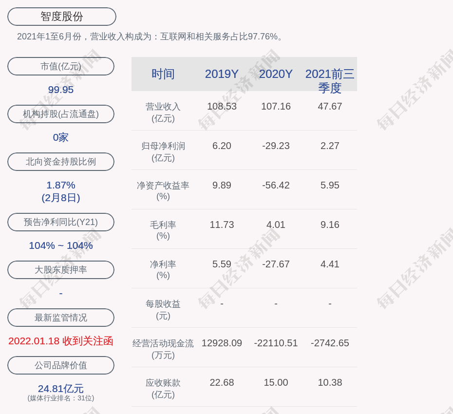 2021年1至6月份,智度股份的营业收入构成为:互联网和相关服务占比97.76%。