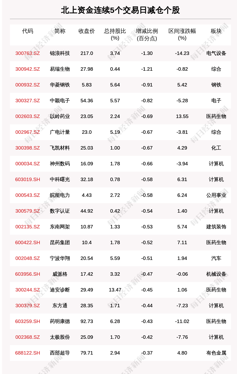 每经AI快讯,2月9日,北上资金连续5个交易日卖出75个股。北上资金连续5个交易日减仓个股中,锦浪科技(300763.SZ,收盘价:217.0元)减持比例增幅最大,5个交易日减持1.30百分点,其他跌幅较大的个股包括易瑞生物(300942.SZ,收盘价:27.98元)、华菱钢铁(000932.SZ,收盘价:5.83元)、中颖电子(300327.SZ,收盘价:54.36元),分别减持1.21个百分点、0.91个百分点、0.82个百分点。