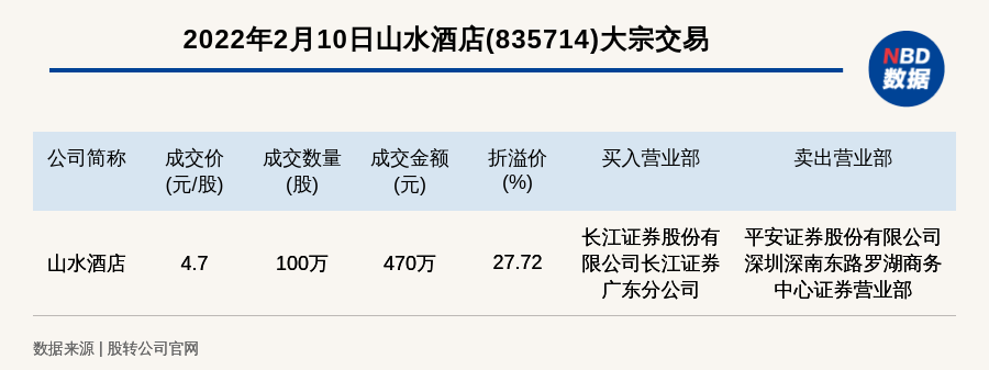 每经讯,2022年2月10日,新三板基础层公司山水酒店(835714)发生一笔大宗交易,成交价4.7元/股,成交数量100万股,成交金额470万元,溢价27.72%。买入营业部是长江证券股份有限公司长江证券广东分公司,卖出营业部是平安证券股份有限公司深圳深南东路罗湖商务中心证券营业部。