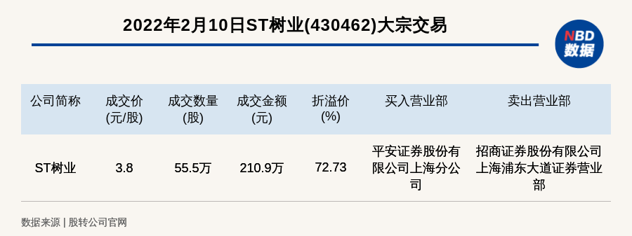 每经讯,2022年2月10日,新三板基础层公司ST树业(430462)发生一笔大宗交易,成交价3.8元/股,成交数量55.5万股,成交金额210.9万元,溢价72.73%。买入营业部是平安证券股份有限公司上海分公司,卖出营业部是招商证券股份有限公司上海浦东大道证券营业部。