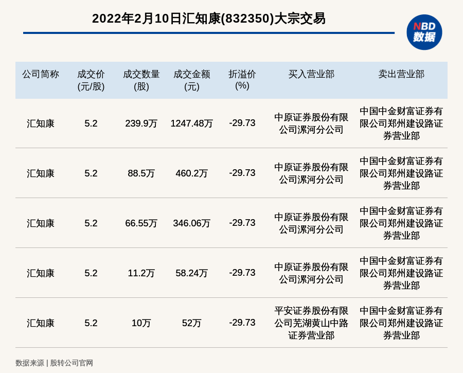 每经讯,2022年2月10日,新三板创新层公司汇知康(832350)发生5笔大宗交易,总成交金额为2163.98万元,成交金额最高的一笔成交价5.2元/股,成交数量239.9万股,成交金额1247.48万元,折价29.73%。买入营业部是中原证券股份有限公司漯河分公司,卖出营业部是中国中金财富证券有限公司郑州建设路证券营业部。