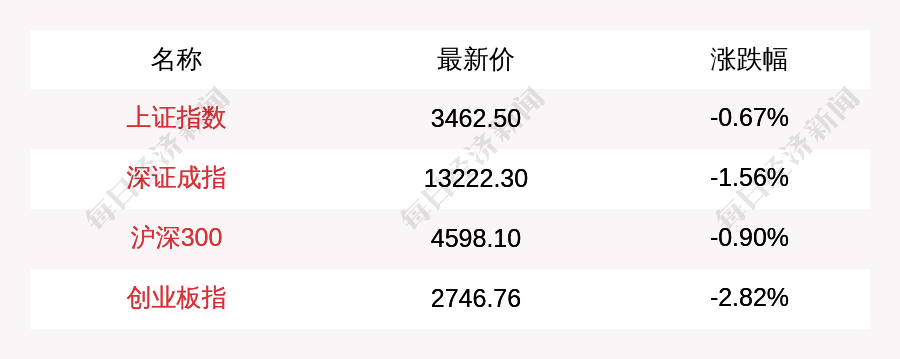 截至北京时间14:30,上证指数报3462.50点,跌0.67%,深证成指报13222.30点,跌1.56%,沪深300报4598.10点,跌0.90%,创业板指报2746.76点,跌2.82%