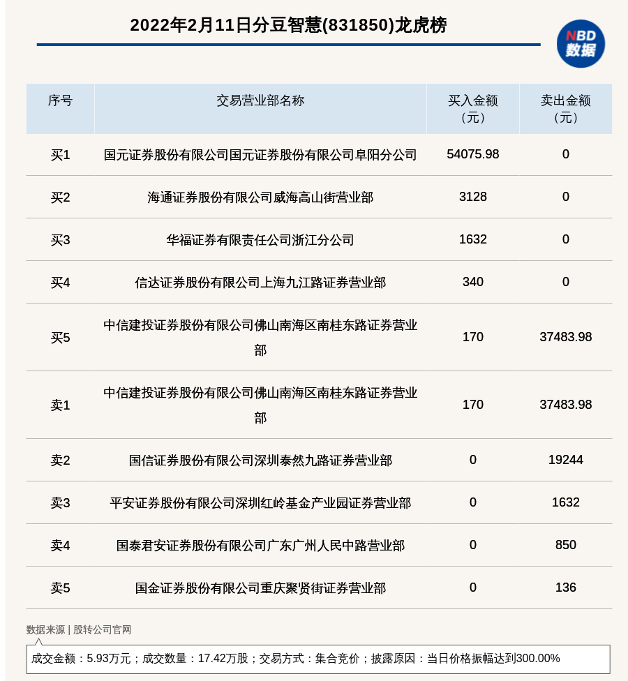 每经讯,2022年2月11日,新三板基础层公司分豆智慧(831850)登上龙虎榜,交易方式是集合竞价,披露原因是当日价格振幅达到300.00%,成交数量17.42万股,成交金额5.93万元。买一席位为国元证券股份有限公司国元证券股份有限公司阜阳分公司,买入5.41万元;卖一席位为中信建投证券股份有限公司佛山南海区南桂东路证券营业部,卖出3.75万元。