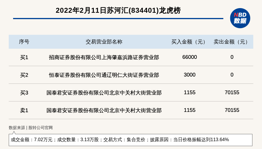 每经讯,2022年2月11日,新三板基础层公司苏河汇(834401)登上龙虎榜,交易方式是集合竞价,披露原因是当日价格振幅达到113.64%,成交数量3.13万股,成交金额7.02万元。买一席位为招商证券股份有限公司上海肇嘉浜路证券营业部,买入6.6万元;卖一席位为国泰君安证券股份有限公司北京中关村大街营业部,卖出7.02万元。