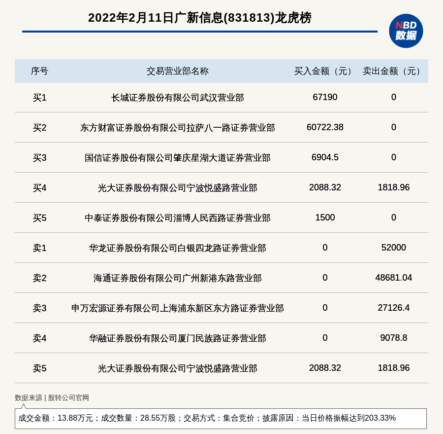 每经讯,2022年2月11日,新三板基础层公司广新信息(831813)登上龙虎榜,交易方式是集合竞价,披露原因是当日价格振幅达到203.33%,成交数量28.55万股,成交金额13.88万元。买一席位为长城证券股份有限公司武汉营业部,买入6.72万元;卖一席位为华龙证券股份有限公司白银四龙路证券营业部,卖出5.2万元。