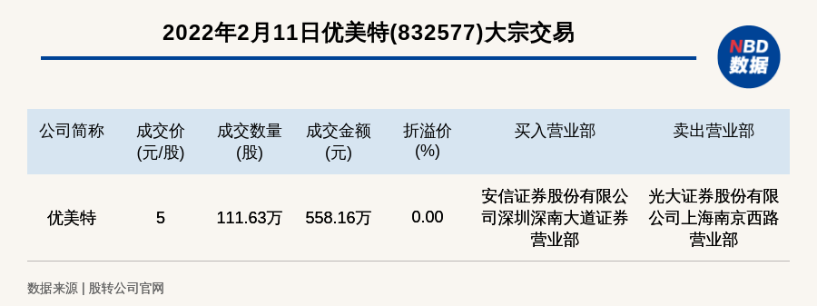 每经讯,2022年2月11日,新三板基础层公司优美特(832577)发生一笔大宗交易,成交价5元/股,成交数量111.63万股,成交金额558.16万元,为平价交易。买入营业部是安信证券股份有限公司深圳深南大道证券营业部,卖出营业部是光大证券股份有限公司上海南京西路营业部。
