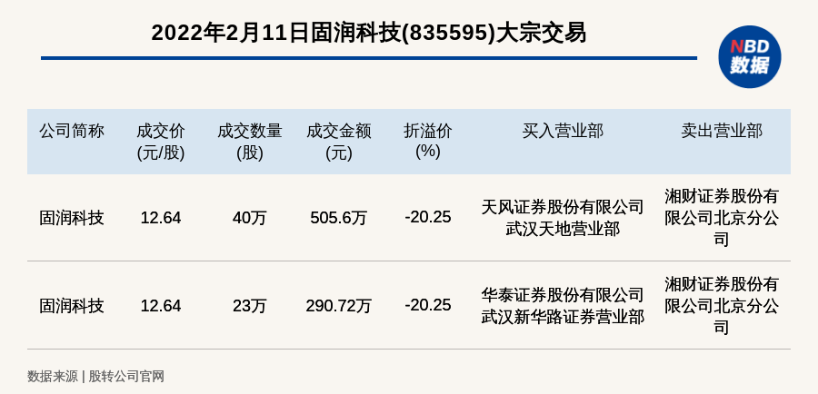 每经讯,2022年2月11日,新三板基础层公司固润科技(835595)发生2笔大宗交易,总成交金额为796.32万元,成交金额最高的一笔成交价12.64元/股,成交数量40万股,成交金额505.6万元,折价20.25%。买入营业部是天风证券股份有限公司武汉天地营业部,卖出营业部是湘财证券股份有限公司北京分公司。
