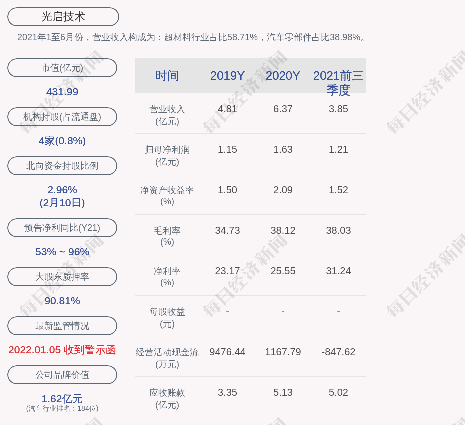 2021年1至6月份,光启技术的营业收入构成为:超材料行业占比58.71%,汽车零部件占比38.98%。
