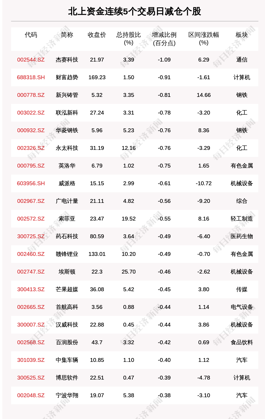 每经AI快讯,2月11日,北上资金连续5个交易日卖出85个股。北上资金连续5个交易日减仓个股中,杰赛科技(002544.SZ,收盘价:21.97元)减持比例增幅最大,5个交易日减持1.09百分点,其他跌幅较大的个股包括财富趋势(688318.SH,收盘价:169.23元)、新兴铸管(000778.SZ,收盘价:5.32元)、联泓新科(003022.SZ,收盘价:27.24元),分别减持0.91个百分点、0.81个百分点、0.78个百分点。