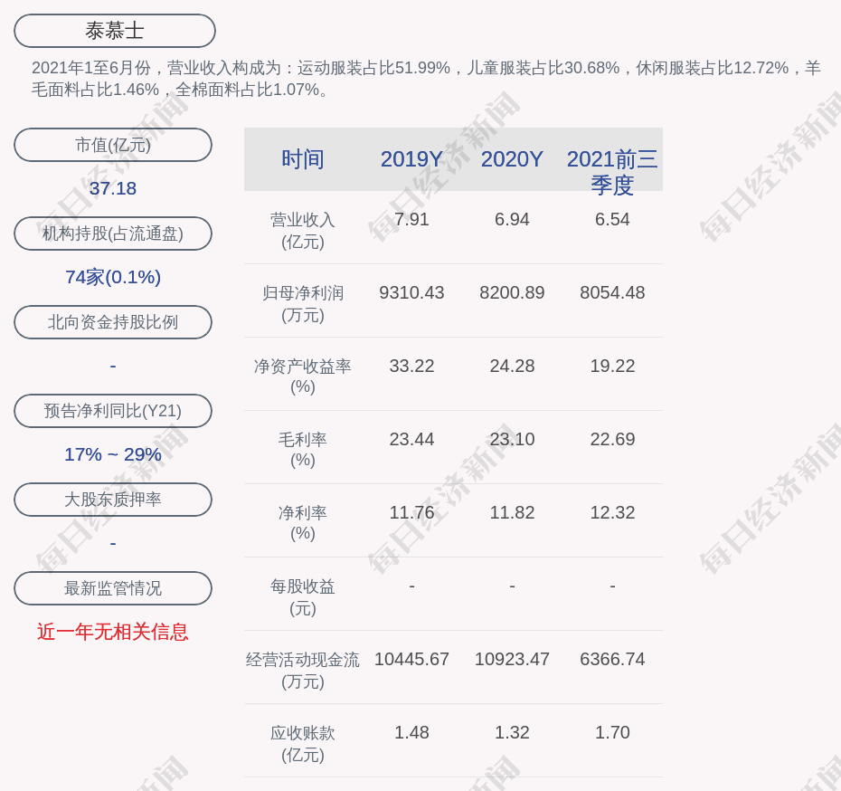 2021年1至6月份,泰慕士的营业收入构成为:运动服装占比51.99%,儿童服装占比30.68%,休闲服装占比12.72%,羊毛面料占比1.46%,全棉面料占比1.07%。