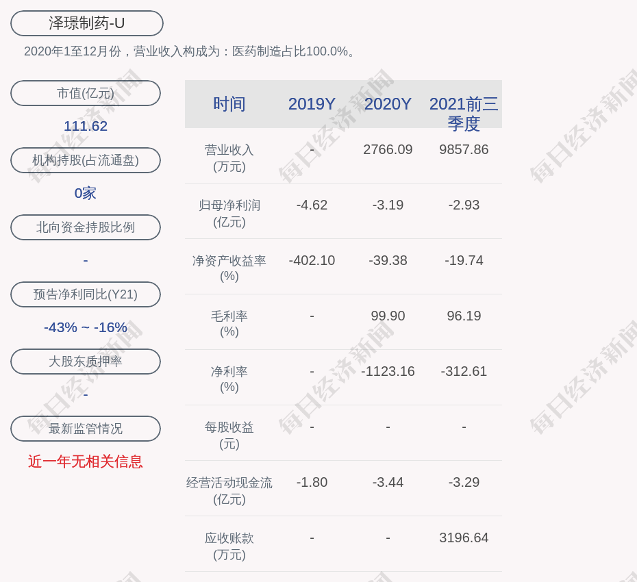 2020年1至12月份,泽璟制药的营业收入构成为:医药制造占比100.0%。