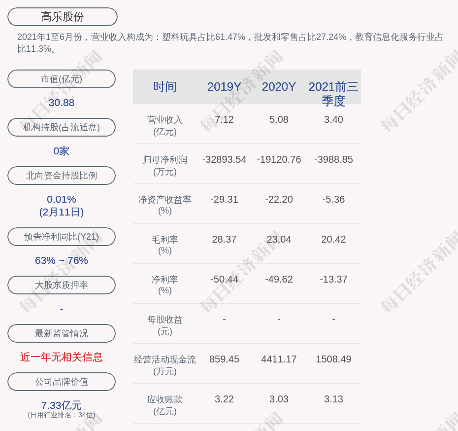 2021年1至6月份,高乐股份的营业收入构成为:塑料玩具占比61.47%,批发和零售占比27.24%,教育信息化服务行业占比11.3%。