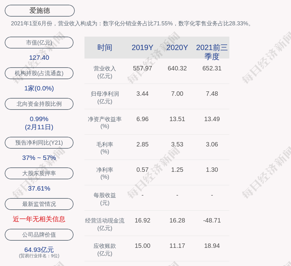 2021年1至6月份,爱施德的营业收入构成为:数字化分销业务占比71.55%,数字化零售业务占比28.33%。
