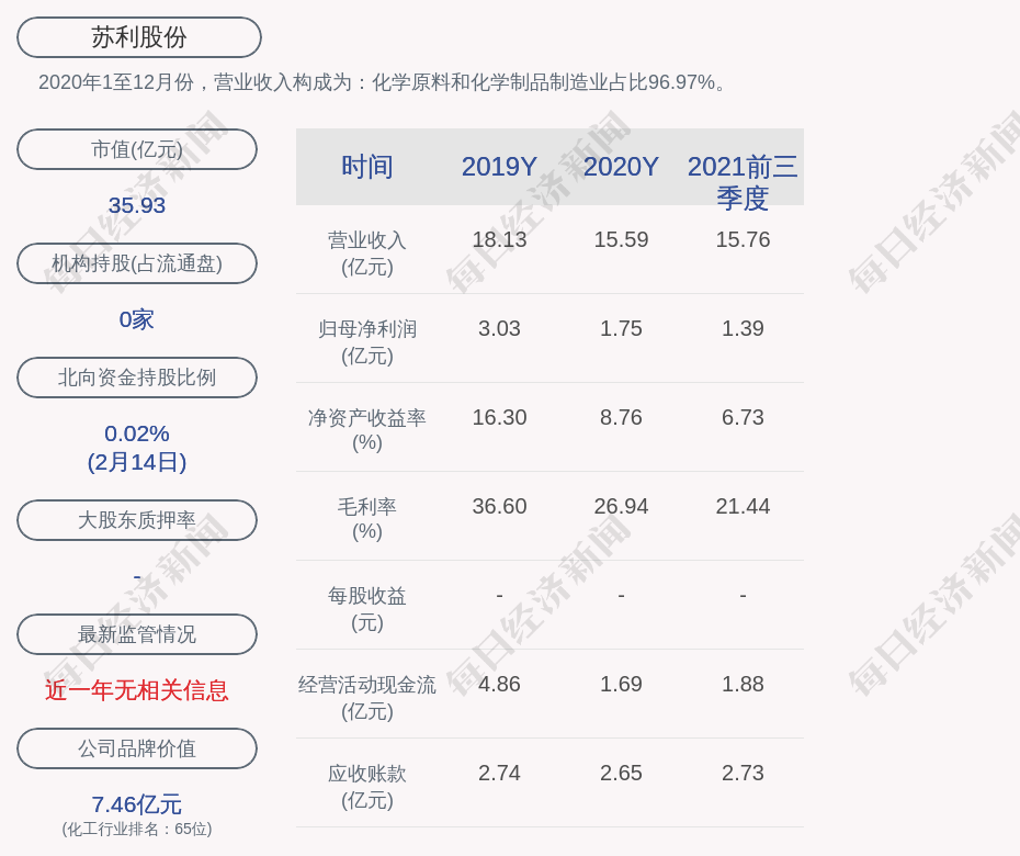 2020年1至12月份,苏利股份的营业收入构成为:化学原料和化学制品制造业占比96.97%。
