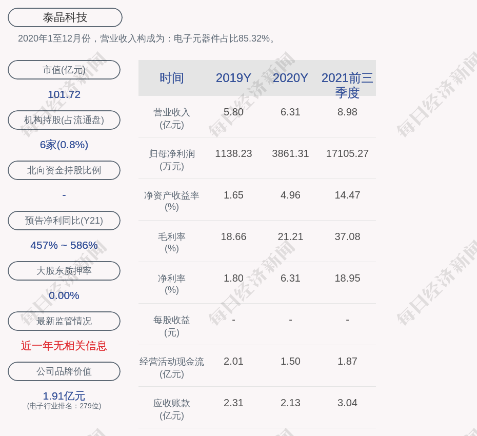 2020年1至12月份,泰晶科技的营业收入构成为:电子元器件占比85.32%。