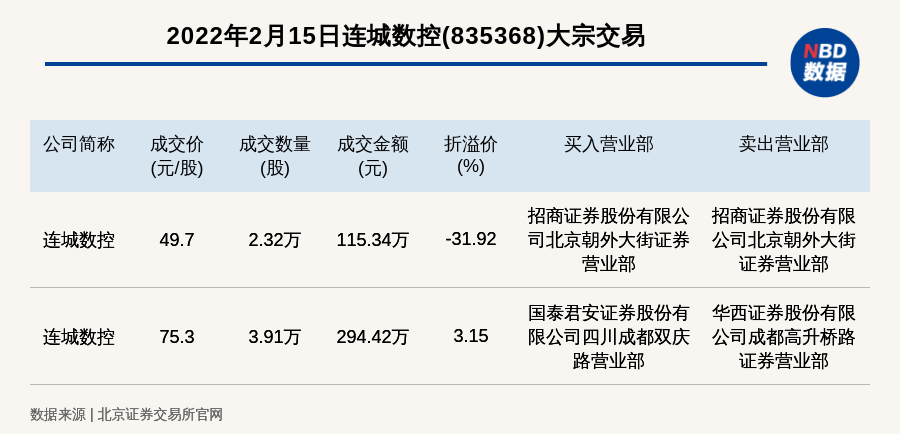 每经讯,2022年2月15日,北交所上市公司连城数控(835368)发生2笔大宗交易,其中一笔成交价49.7元/股,成交数量2.32万股,成交金额115.34万元,折价31.92%。买入营业部是招商证券股份有限公司北京朝外大街证券营业部,卖出营业部是招商证券股份有限公司北京朝外大街证券营业部。