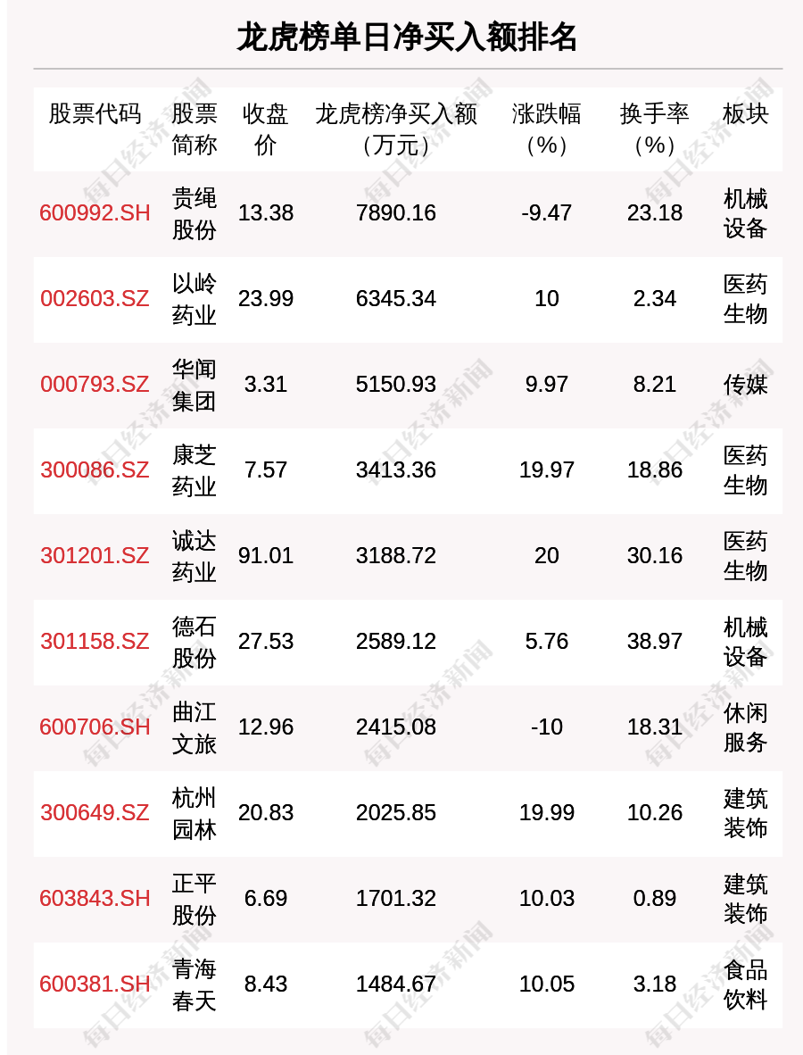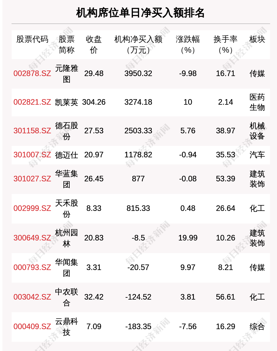 在龙虎榜中,涉及机构专用席位的个股有20只,净买入额前三的是元隆雅图、凯莱英、德石股份,分别为3950.32万元、3274.18万元、2503.33万元。