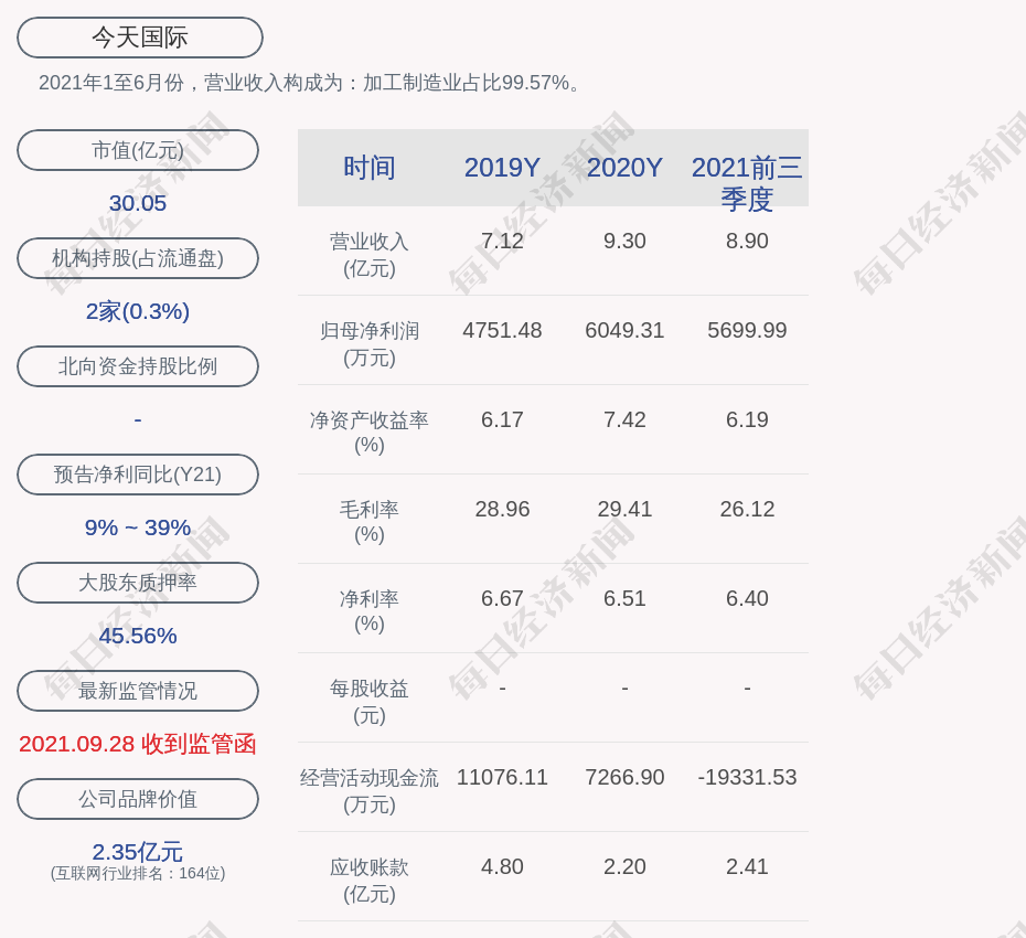 2021年1至6月份,今天国际的营业收入构成为:加工制造业占比99.57%。