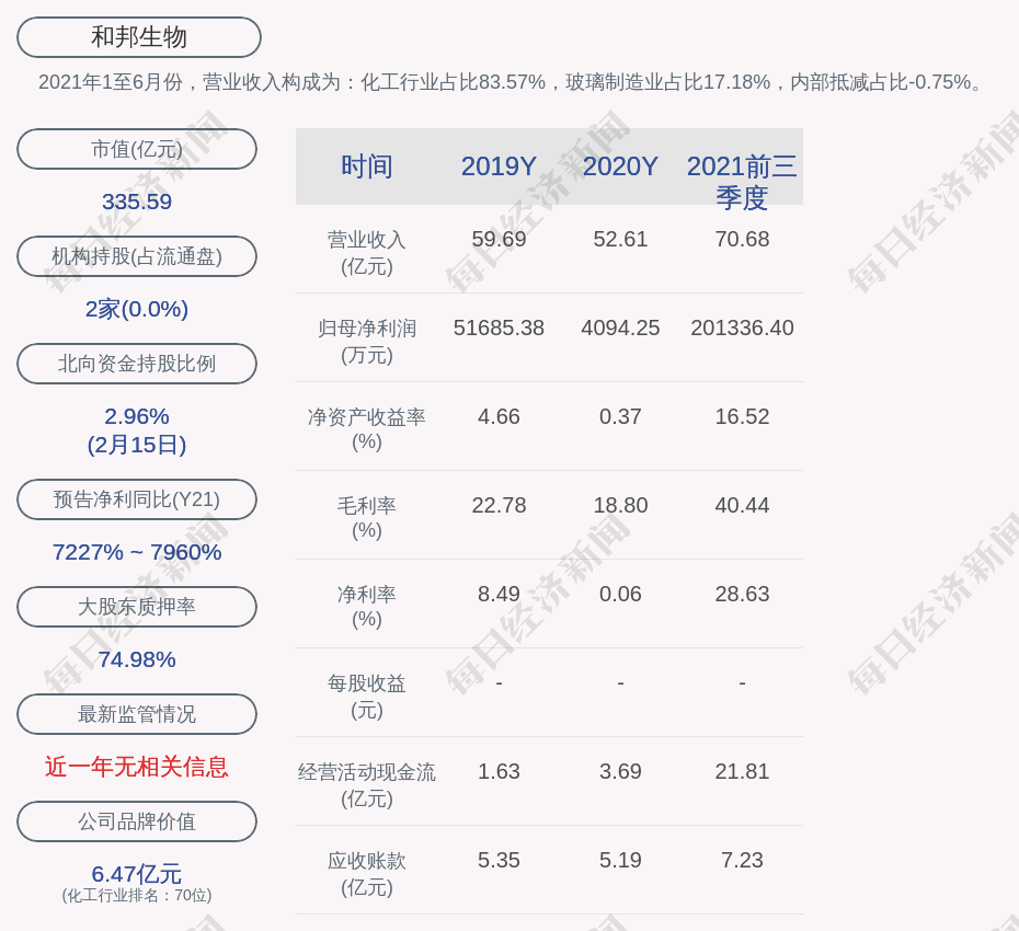 2021年1至6月份,和邦生物的营业收入构成为:化工行业占比83.57%,玻璃制造业占比17.18%,内部抵减占比-0.75%。