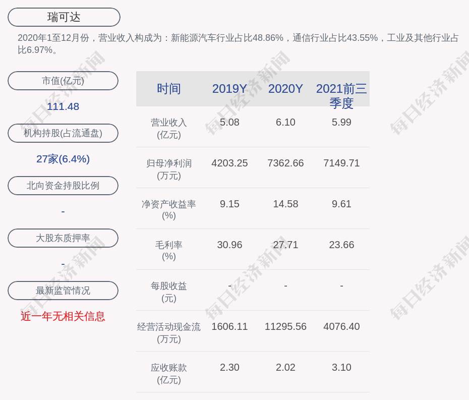2020年1至12月份,瑞可达的营业收入构成为:新能源汽车行业占比48.86%,通信行业占比43.55%,工业及其他行业占比6.97%。
