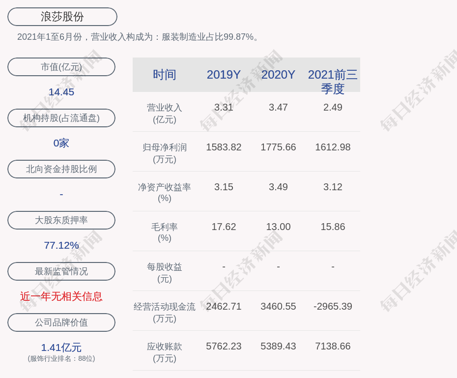 2021年1至6月份,浪莎股份的营业收入构成为:服装制造业占比99.87%。