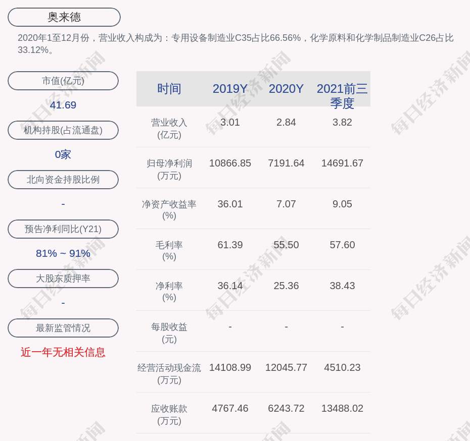 2020年1至12月份,奥来德的营业收入构成为:专用设备制造业C35占比66.56%,化学原料和化学制品制造业C26占比33.12%。