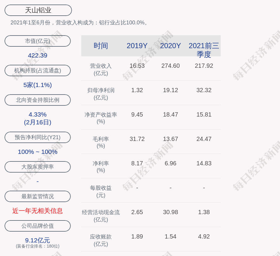 2021年1至6月份,天山铝业的营业收入构成为:铝行业占比100.0%。