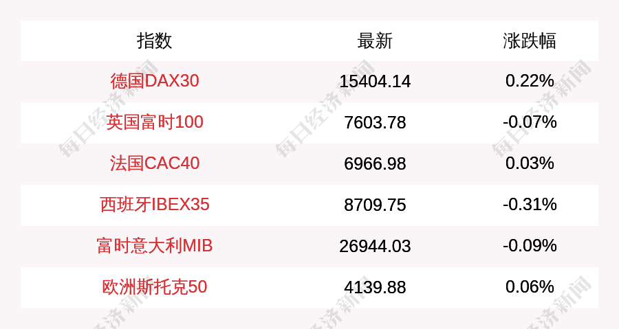 每经AI快讯:北京时间2月17日16:00,德国DAX30指数开盘上涨33.84点,涨幅为0.22%,报15404.14点;英国富时100指数开盘下跌5.58点,跌幅为0.07%,报7598.2点;法国CAC40指数开盘上涨2.0点,涨幅为0.03%,报6966.98点;西班牙IBEX35指数开盘下跌27.45点,跌幅为0.31%,报8709.75点;富时意大利MIB指数开盘下跌25.29点,跌幅为0.09%,报26944.03点;欧洲斯托克50指数开盘上涨2.66点,涨幅为0.06%,报4139.88点。