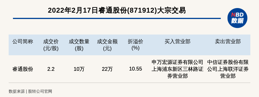 每经讯,2022年2月17日,新三板基础层公司睿通股份(871912)发生一笔大宗交易,成交价2.2元/股,成交数量10万股,成交金额22万元,溢价10.55%。买入营业部是申万宏源证券有限公司上海浦东新区三林路证券营业部,卖出营业部是中信证券股份有限公司上海联洋证券营业部。
