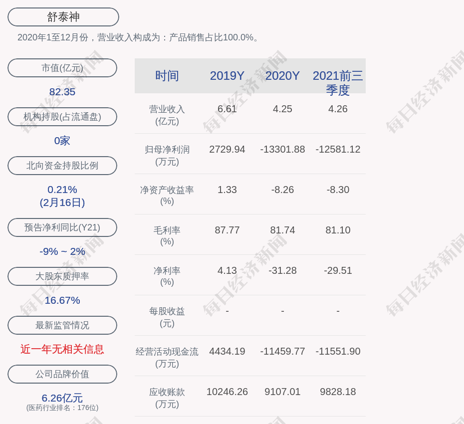 2020年1至12月份,舒泰神的营业收入构成为:产品销售占比100.0%。