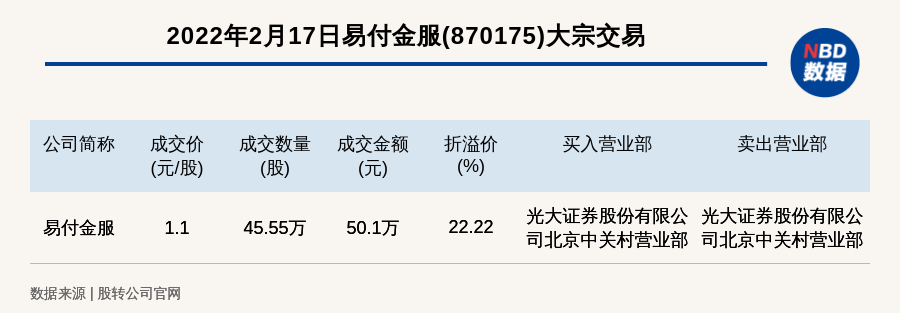 每经讯,2022年2月17日,新三板基础层公司易付金服(870175)发生一笔大宗交易,成交价1.1元/股,成交数量45.55万股,成交金额50.1万元,溢价22.22%。买入营业部是光大证券股份有限公司北京中关村营业部,卖出营业部是光大证券股份有限公司北京中关村营业部。