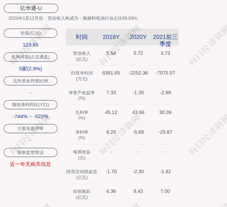 2020年1至12月份,亿华通的营业收入构成为:氢燃料电池行业占比99.93%。