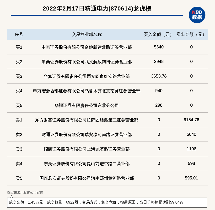 每经讯,2022年2月17日,新三板创新层公司精通电力(870614)登上龙虎榜,交易方式是集合竞价,披露原因是当日价格振幅达到59.04%,成交数量6922股,成交金额1.45万元。买一席位为中泰证券股份有限公司余姚新建北路证券营业部,买入5640元;卖一席位为东方财富证券股份有限公司拉萨团结路第二证券营业部,卖出6154.76元。