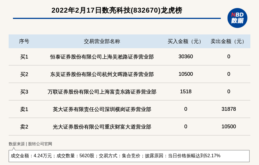 每经讯,2022年2月17日,新三板创新层公司数亮科技(832670)登上龙虎榜,交易方式是集合竞价,披露原因是当日价格振幅达到52.17%,成交数量5620股,成交金额4.24万元。买一席位为恒泰证券股份有限公司上海吴淞路证券营业部,买入3.04万元;卖一席位为英大证券有限责任公司深圳横岗证券营业部,卖出3.19万元。