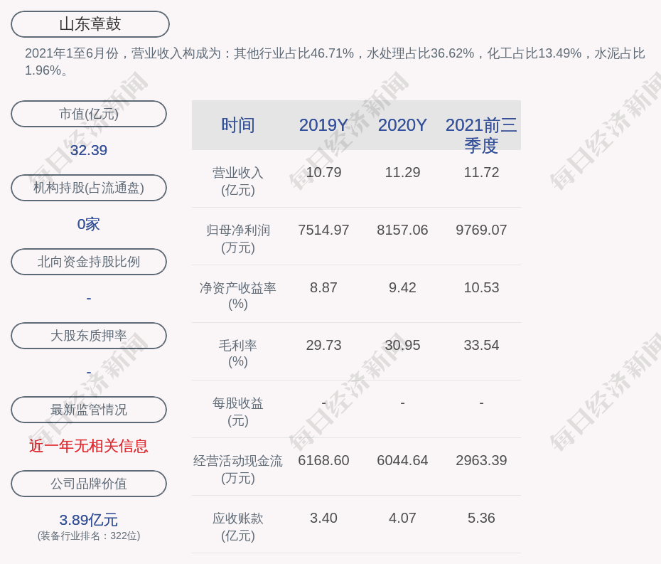 2021年1至6月份,山东章鼓的营业收入构成为:其他行业占比46.71%,水处理占比36.62%,化工占比13.49%,水泥占比1.96%。