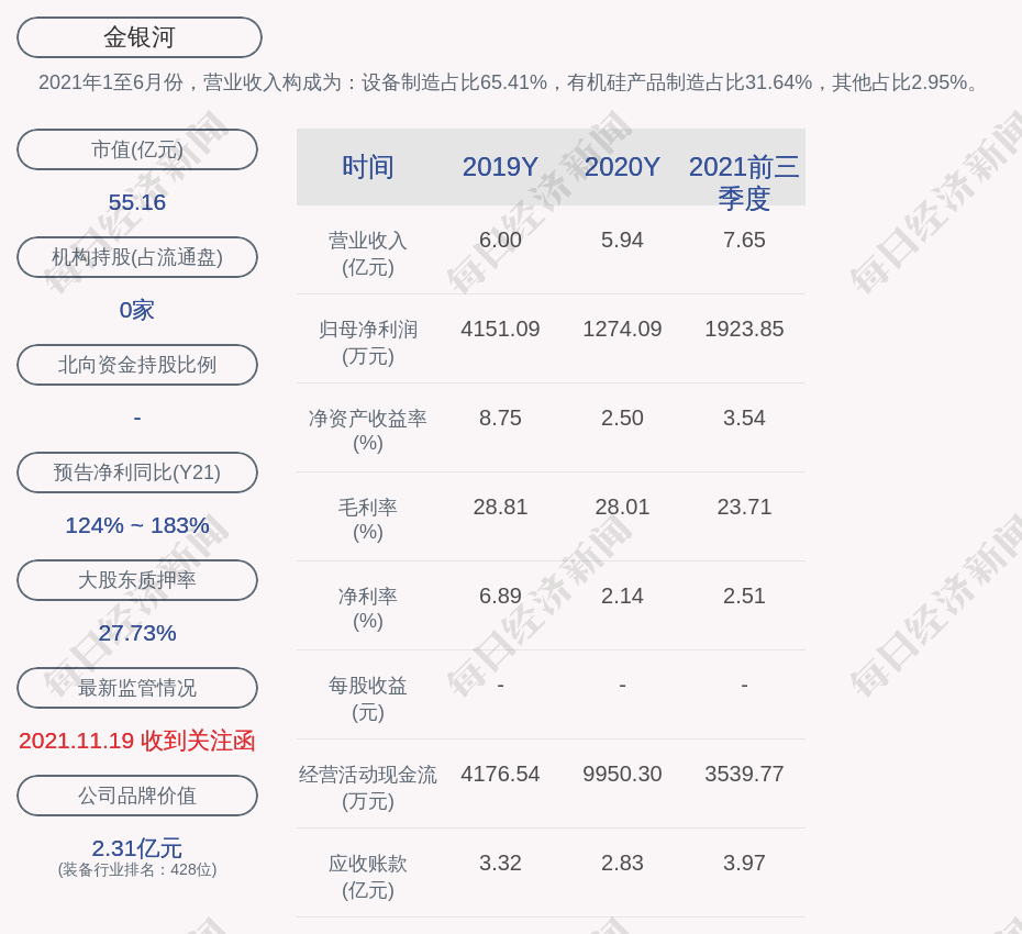 2021年1至6月份,金银河的营业收入构成为:设备制造占比65.41%,有机硅产品制造占比31.64%,其他占比2.95%。