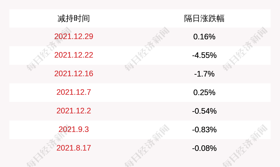 2. 锦盛新材上次发布减持公告是2021年12月29日,第二个交易日上涨0.16%,锦盛新材近一年共发布8次减持类公告。