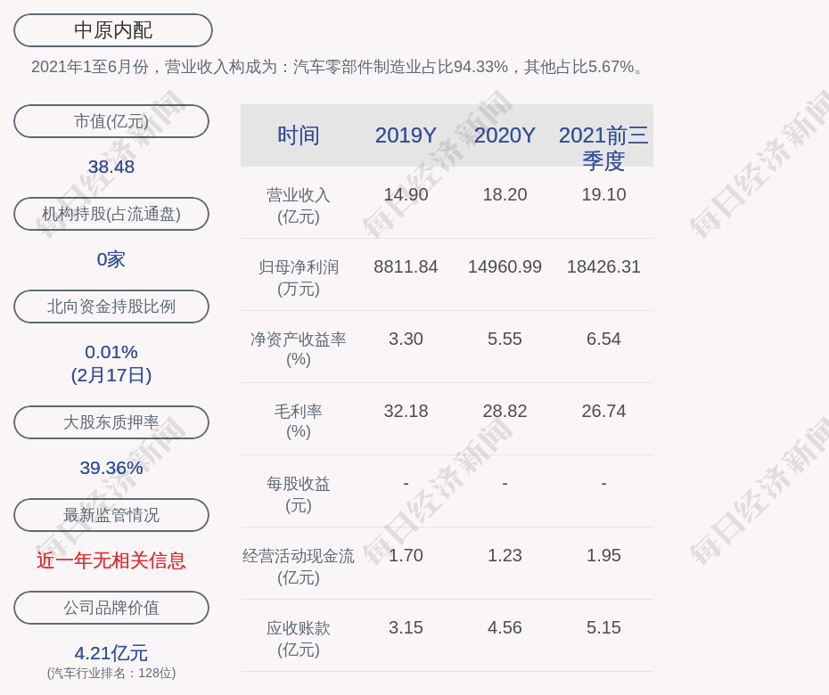 2021年1至6月份,中原内配的营业收入构成为:汽车零部件制造业占比94.33%,其他占比5.67%。