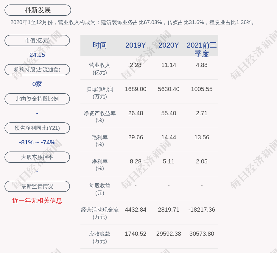 2020年1至12月份,科新发展的营业收入构成为:建筑装饰业务占比67.03%,传媒占比31.6%,租赁业占比1.36%。