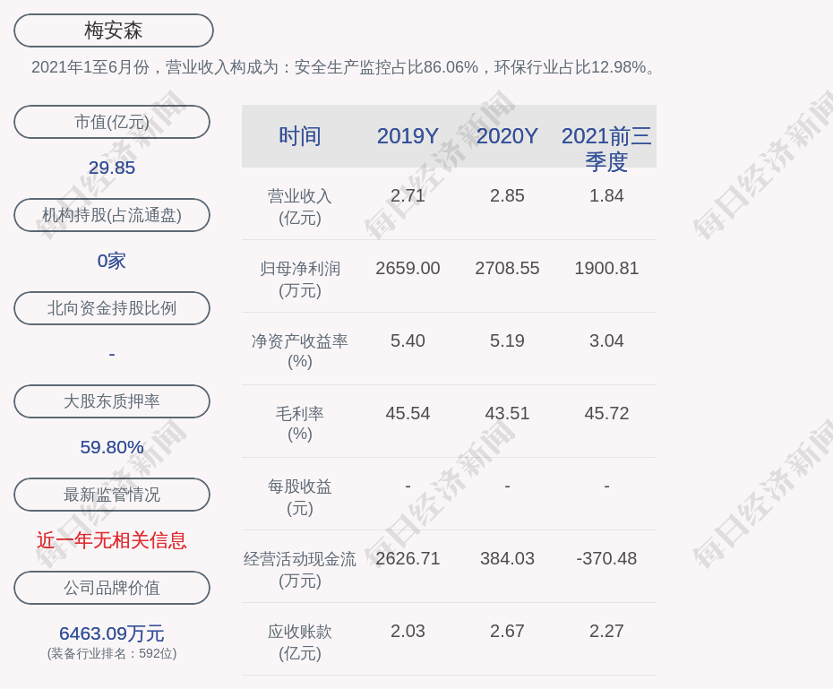 2021年1至6月份,梅安森的营业收入构成为:安全生产监控占比86.06%,环保行业占比12.98%。