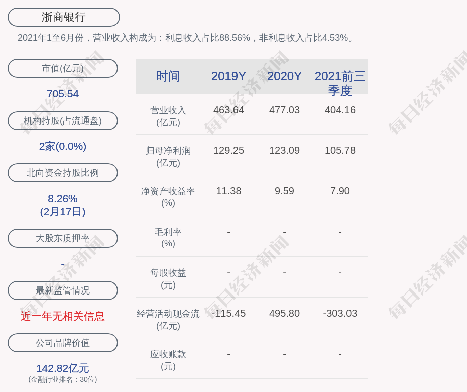 2021年1至6月份,浙商银行的营业收入构成为:利息收入占比88.56%,非利息收入占比4.53%。